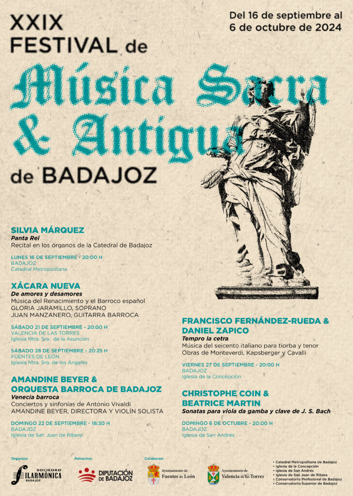El XXIX Festival de Música Sacra y Antigua de Badajoz celebra una nueva edición poniendo el foco en los grandes intérpretes y referentes de la música antigua de España y Europa. Del 16 de septiembre al 6 de octubre, esta cita musical organizada por la Sociedad Filarmónica de Badajoz, con el patrocinio de la Diputación de Badajoz, reunirá a artistas de gran relevancia internacional como la violinista Amandine Beyer, el violagambista Christophe Coin o la clavecinista Béatrice Martin.