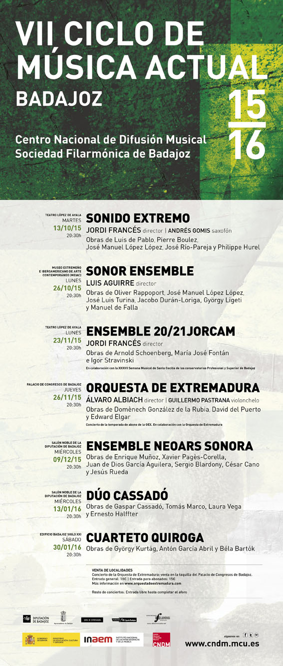 EL PROGRAMA DEL VII CICLO DE MÚSICA ACTUAL, QUE INCLUYE SIETE CONCIERTOS Y 11 ESTRENOS por Sociedad Filarmónica de Badajoz | NoticiasEnviar comentarioTu dirección de correo electrónico no será publicada. Los campos obligatorios están marcados con *Comentario *Nombre * Correo electrónico * Web