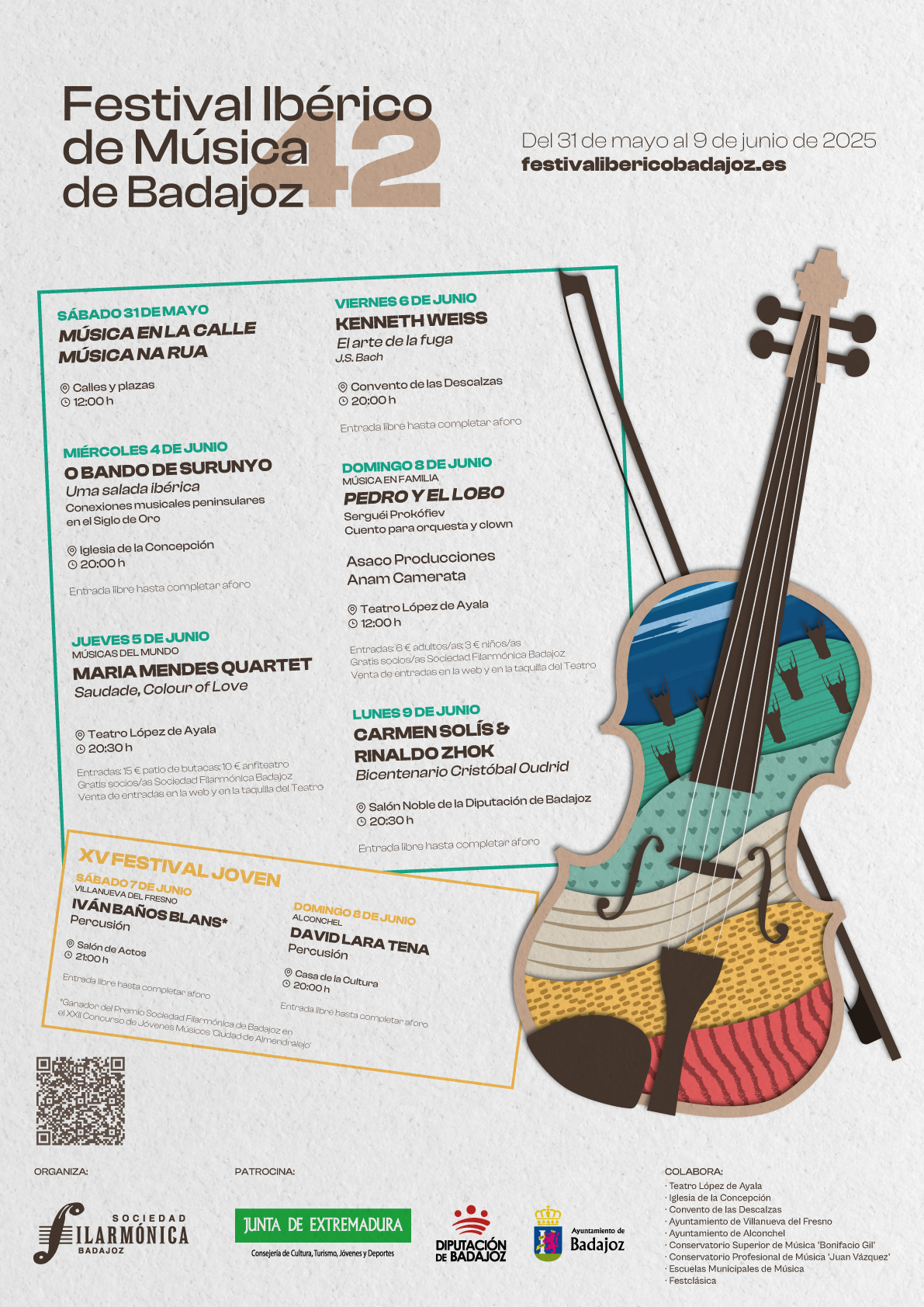 El 42 Festival Ibérico de Música de Badajoz (FIMBA) ofrecerá 31 de mayo al 9 de junio de 2025 diferentes músicas y nuevas propuestas. La reinterpretación del género musical más emblemático de Portugal, el fado, en la voz de la cantante de jazz portuguesa Maria Mendes o ‘El arte de la fuga’ de Bach interpretado por el reconocido clavecinista neoyorquino Kenneth Weiss, serán algunas de las novedades de esta edición.